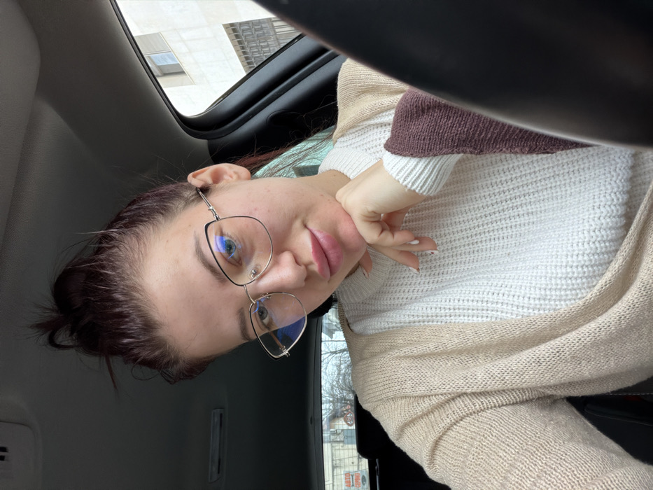 - "A female subject with dark hair tied in a messy bun, wearing gold-framed glasses, and a multi-colored knitted sweater (cream/beige, white, and dark maroon sleeve) is positioned inside a vehicle, occupying the front passenger seat" by FM-Evuj73, licensed under CC BY 4.0