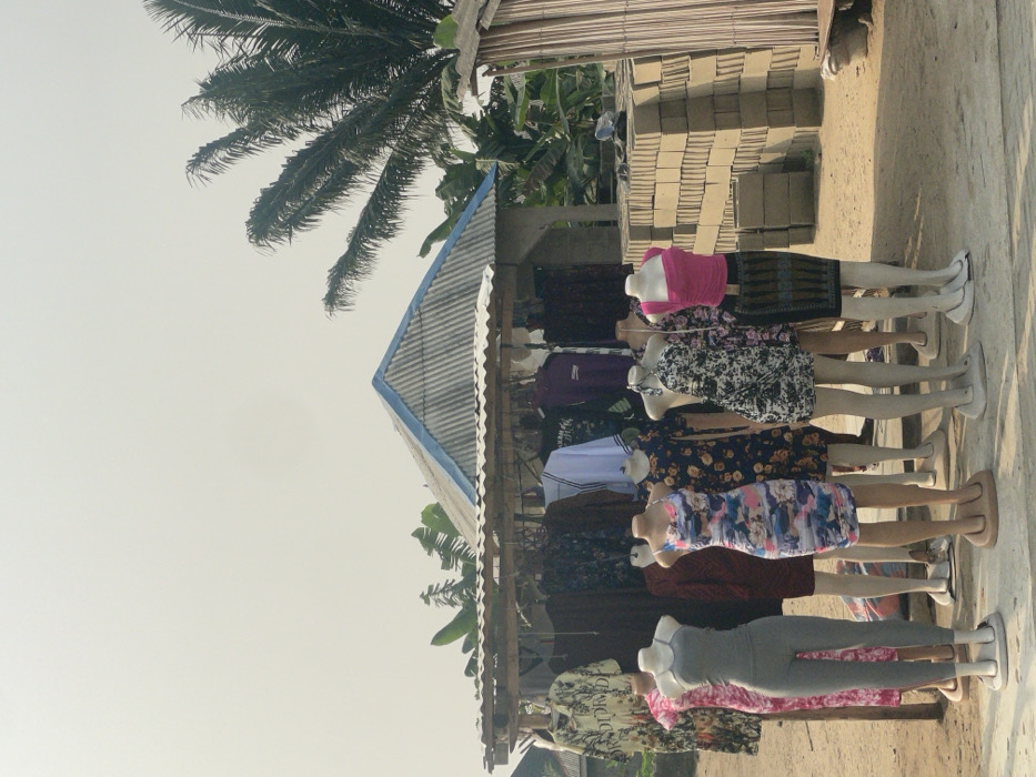 The scene depicts an outdoor retail clothing display in Itoga, Nigeria, under a hazy, light-grey sky