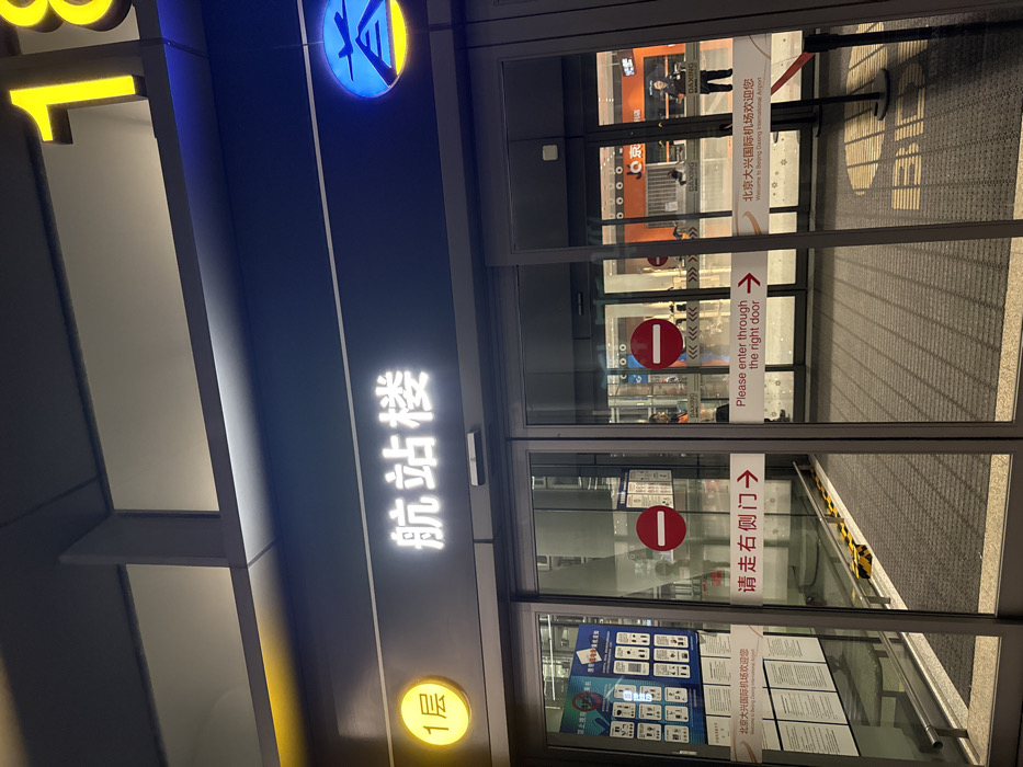 The image depicts the entrance to the terminal building at Beijing Daxing International Airport, located partially within Langfang, China