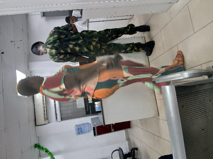 The image depicts an indoor public service area or office in Alaiyabiagba, Nigeria. The environment features white walls, a white ceiling with square fluorescent light panels, and a tiled floor. An adult female, in motion and partially blurred, occupies the mid-ground, walking from left to right. She wears a two-piece outfit with an abstract geometric pattern in shades of orange, green, teal, and maroon, paired with gold-colored, embellished flat sandals. Her hair is short and dark. Behind her, an adult male stands with his back to the viewer, dressed in a military-style camouflage uniform (green, brown, black pattern), black combat boots, and a dark beret, positioned at a white service counter. Behind the counter, an adult male employee, wearing a white collared shirt and a dark tie, is seated, facing the man in uniform. Visible objects include a wall-mounted air conditioning unit, a water dispenser with a blue bottle atop a small red cabinet, a black swivel office chair, and a silver metal waiting bench with perforated seats in the foreground. Green tinsel decor hangs from the ceiling on the far left.
