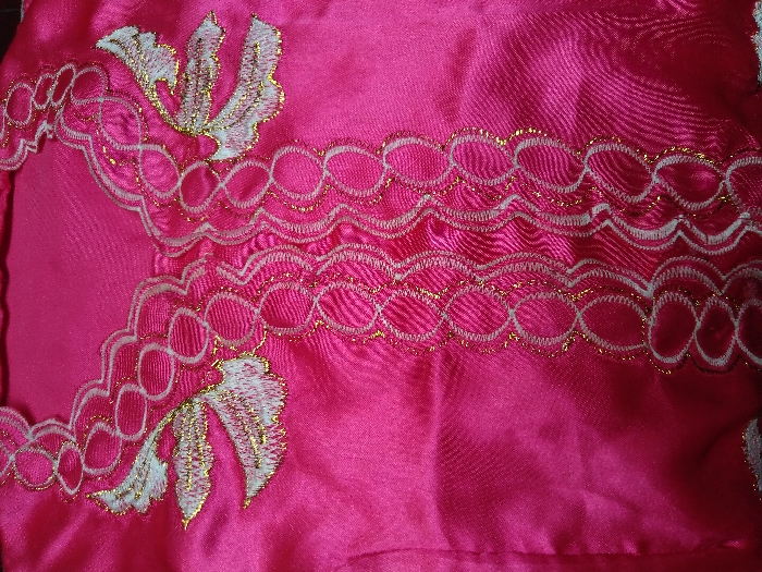 The image displays a hot pink (fuchsia) garment, likely the upper portion of a dress or tunic, laid flat. The fabric exhibits a slight sheen consistent with satin or a synthetic blend. The garment features elaborate embroidery along the neckline and central front area. The embroidery consists of white thread outlining patterns, accented with metallic gold thread. Two symmetrical, stylized motifs, resembling wings or floral designs, are positioned on either side of the neckline opening, extending towards the shoulders. A central vertical panel features a continuous, interwoven pattern of connected loops or chains, also in white with gold accents. The garment is devoid of any individuals, actions, or interactions. The environment and a specific location within Pokhara, Nepal, are not discernible from the provided visual information.