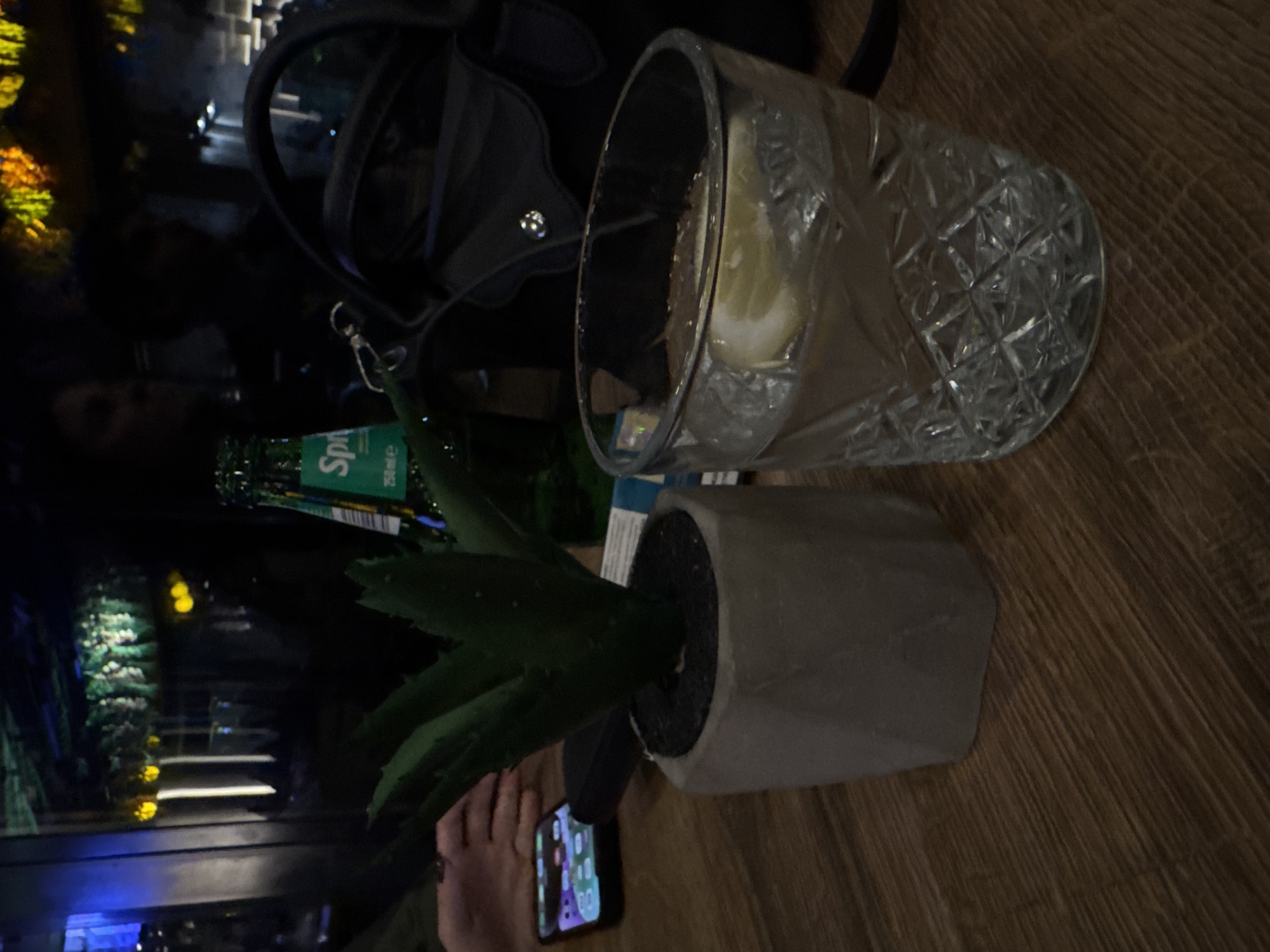 The image depicts a dimly lit table setting, seemingly indoors. A decorative glass with liquid and a lemon slice sits prominently on the table. Adjacent to it is a small potted succulent. A bottle of Sprite is partially visible behind the plant. A black bag lies in the background. A hand is visible holding a smartphone next to the potted plant. The scene appears to be set in a restaurant or bar. The city and location are unknown, although the prompt mentions Goce Delcev, Bulgaria.