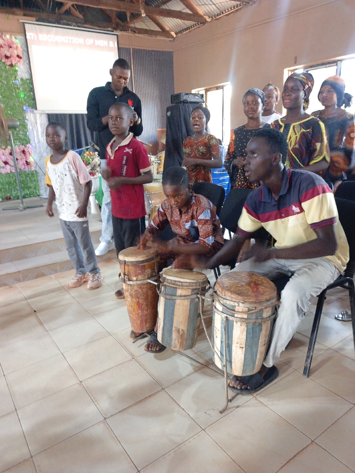 A group of people are gathered indoors, seemingly performing music. Two young men are playing drums while seated. Several others, including children and adults, stand or sit behind them, some singing. A man in a black shirt stands near the children. The background includes a decorated screen and windows. The floor is tiled. The lighting is bright.
