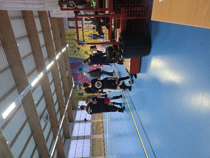 The image captures the interior of a sports hall, presumably in Leers, France. The flooring is a bright blue synthetic court marked with yellow and black lines. The ceiling features exposed wooden beams and white corrugated panels, from which linear fluorescent light fixtures are suspended. High, rectangular windows are visible on the left wall. The far wall displays a multi-colored climbing wall adorned with numerous hand and foot holds. Multiple individuals, predominantly young males and adults, are present. Several are dressed in black athletic shirts, some with visible logos. One young male, wearing a black t-shirt with a white circular logo on the back, black shorts, and black shin guards, stands shoeless on the court beside a pair of shoes. Another individual wears red shorts and black shin guards. Groups of people are gathered in the mid-ground near the base of the climbing wall, appearing to converse or observe. On the right side of the frame, a red metal barrier or structure is present, with additional individuals visible behind it. In the foreground, a black cylindrical trash can containing a black liner rests beside a red rectangular platform. A light-colored wooden surface, possibly a table or counter, partially extends into the lower right corner of the frame. The scene suggests an active environment, possibly a sports practice, competition, or gathering.