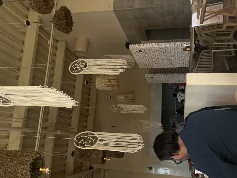 This image captures the interior of a casual dining establishment in Santiago de Querétaro, Mexico, characterized by a bohemian aesthetic. The scene is illuminated by ambient lighting, with a clear view into a service area in the background. In the foreground, a male subject is seated at a table, facing away from the camera. He possesses short, dark hair and wears eyeglasses. His attire consists of a dark blue long-sleeved shirt, with a dark strap visible over his left shoulder, possibly from a bag. The table he occupies is largely obscured by his posture and the angle. The establishment's ceiling features exposed white-painted corrugated metal, support beams, and utility pipes. Numerous decorative elements hang from the ceiling at varying lengths. These include multiple large and small macrame dreamcatchers with white string tassels, and several pendant light fixtures. Some light fixtures are covered with woven natural fiber shades, either bell-shaped or cylindrical, in shades of brown or beige, with visible Edison-style bulbs. Other fixtures feature lighter, fringed material. The walls in the mid-ground and background are painted a light cream color in their upper sections. A white tiled counter or bar runs horizontally across the mid-ground, separating the dining area from a service or kitchen area beyond. Below this line, to the right, are vertically oriented partition walls constructed from white-painted bricks. Further right, the wall features a darker, possibly grey, large-format tile or concrete block pattern. A green exit sign is partially visible on the far left wall. In the background service area, several indistinct figures are visible. One individual, wearing a light-colored top, stands behind a counter. Other figures are partially obscured, suggesting activity within the service space. To the right of the foreground subject, several empty tables and chairs are arranged. The chairs are constructed from light-colored woven wood or rattan. On one table, a caddy containing condiment bottles (one red, one brown) is present, along with a white menu resting on a chair. The floor is not distinctly visible but appears to be a light-colored, possibly tiled surface beneath the tables.