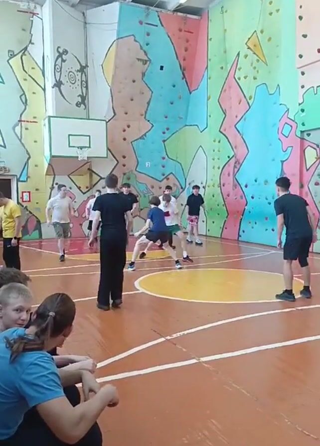 group of about a dozen male youths playing dodgeball in a school gym. The gym has a climbing wall painted with colorful abstract patterns along one wall. Two girls are sitting on the floor watching the game. The players are spread out on the court, and the ball is being thrown.