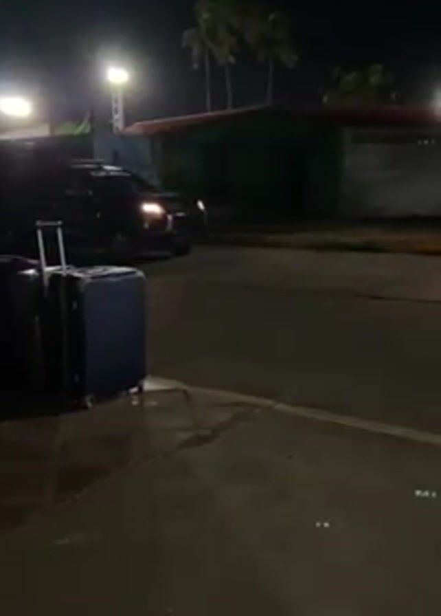 dimly lit street scene at night. In the foreground, on a sidewalk, are two blue suitcases with pull handles. A black pickup truck with its headlights on drives slowly towards the camera on the street. The truck has a white emblem and writing on the side and a light bar on top of the cab. Behind the truck, there is a small building with a green roof. Palm trees are visible in the background. Streetlights illuminate the scene. The truck slows to a stop. A person is visible in the driver's seat.