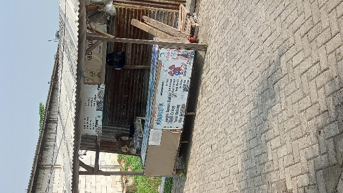 A small, weathered roadside stall stands on a brick-paved area. It's constructed with corrugated metal and wood, displaying a faded menu or sign with Indonesian text. The offerings appear to include snacks like Aneka Sosis Bakar and Telur Gulung. The structure looks simple and possibly makeshift, reflecting a humble, informal business setting. Vegetation can be seen behind the stall.