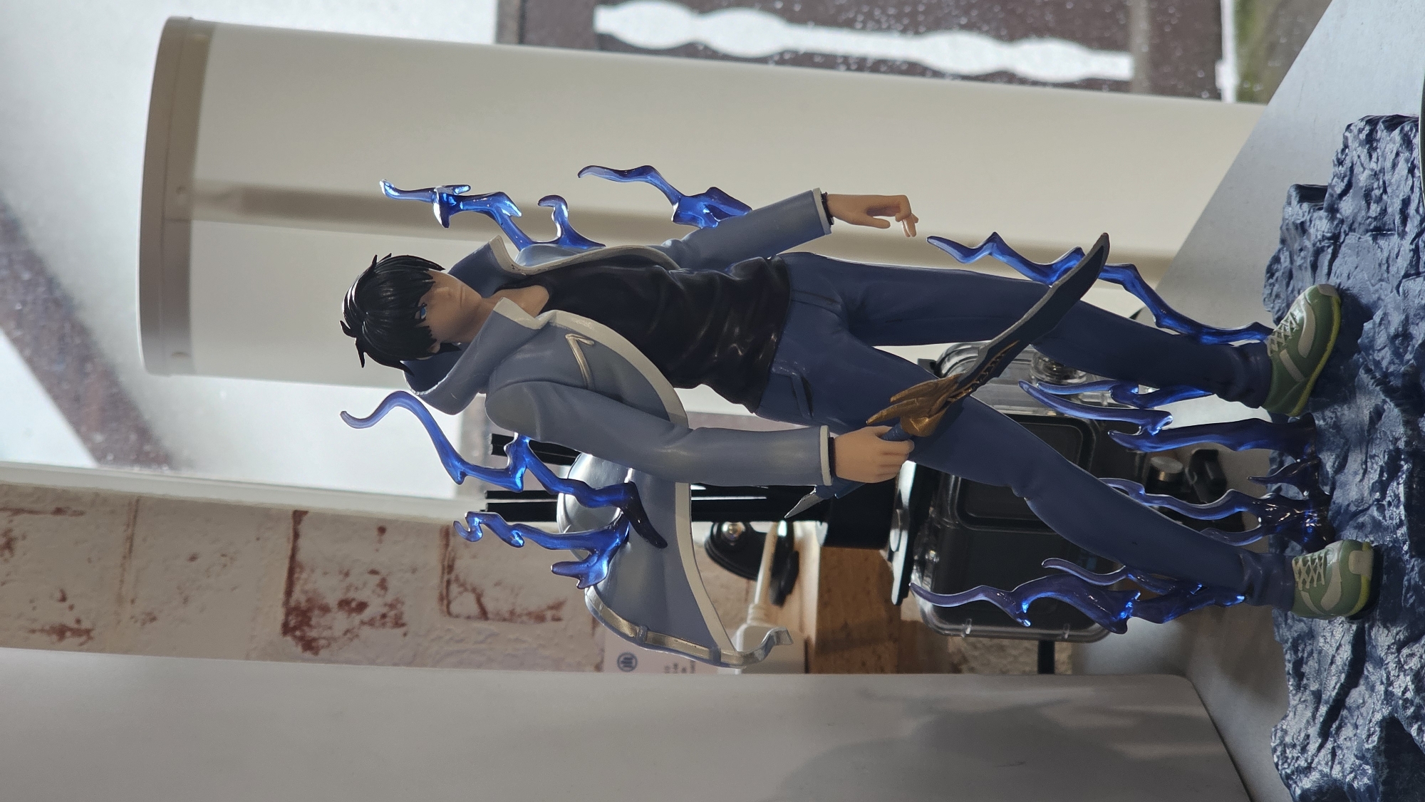 A detailed image depicts a PVC figurine of a male anime character positioned indoors, near a window. The figurine stands approximately 10-12 inches tall, depicting a male with short black hair and blue eyes, wearing a light blue jacket with white trim over a black shirt, dark blue pants, and light green sneakers with yellow soles. He holds a dark-bladed weapon with a golden hilt in his right hand, pointed downward. Translucent blue, flame-like or energy-like structures emanate from his back, waist, and legs, connecting to a dark blue, textured base resembling rocks or turbulent energy. The figurine is situated on a dark, flat surface. In the immediate background, to the left, a light-colored wall with faint reddish-brown marks, possibly indicating distressed brickwork or staining, is visible. To the right, a blurred window shows an ambiguous outdoor scene, possibly overcast or snowy, and a vertical, white, cylindrical object. A black action camera, possibly a GoPro, encased in a clear waterproof housing, is visible behind and to the left of the figurine's lower body. The lighting suggests ambient illumination primarily from the window. The precise location within Leidersbach, Germany, cannot be determined from the visual information provided in the image.