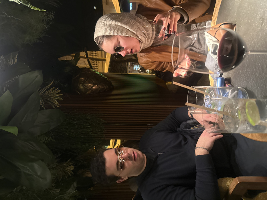 A sideways shot depicts two people at a table, each with a drink. The person on the left has dark hair and wears glasses and a dark blue shirt. The person on the right wears sunglasses, a light tan hat, and a brown jacket. A glass of red wine is visible, along with a clear drink with a lime wedge. There are green plants visible on the left and a decorative object on the wall behind the people.