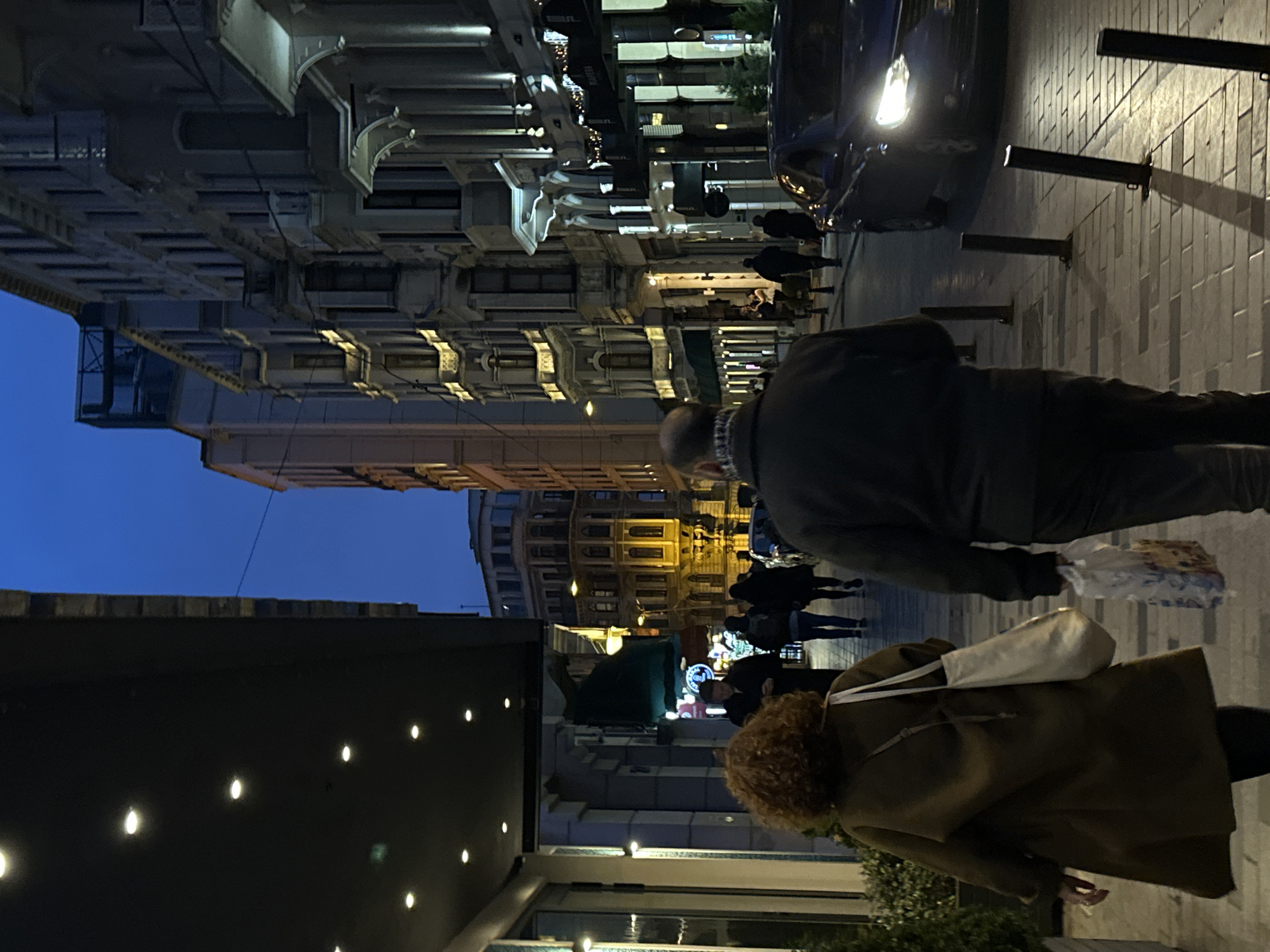 The image captures a street scene at dusk in Beyoğlu, Istanbul, Turkey, likely on or near Meşrutiyet Caddesi. The sky above is a deep indigo blue, indicating late twilight, while artificial lighting from buildings and street fixtures illuminates the environment. The street is paved with rectangular stone blocks, and dark metal bollards line the edge of a pedestrian walkway. On the left, a modern commercial building features a dark overhang with recessed circular lights and a glass facade. On the right, a row of multi-story historical buildings with ornate facades, bay windows, balconies, and decorative string lights extends into the distance. One building displays a sign that reads "RAPERA". In the immediate foreground, two individuals walk away from the camera. The person on the left has curly reddish-brown hair and wears a long, dark olive-green coat, carrying a white tote bag over their left shoulder. To their right, a bald individual in a dark jacket with a patterned neck scarf holds a clear plastic shopping bag containing colorful items in their left hand. Further down the street, multiple other pedestrians are visible, walking in the same direction or standing. Some individuals appear to be looking at their mobile phones. On the right side of the street, a dark blue sedan with illuminated headlights is either stationary or moving slowly.