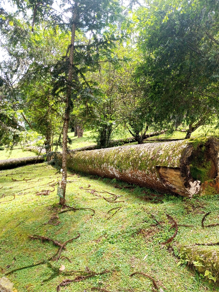 A vibrant, sunny outdoor scene shows a fallen tree covered in moss, lying on a grassy, clover-filled ground. A smaller tree grows nearby, its roots exposed. The background features a lush forest with green trees. The fallen tree is the focal point, showcasing its size and texture. Sunlight filters through the trees, illuminating the scene.