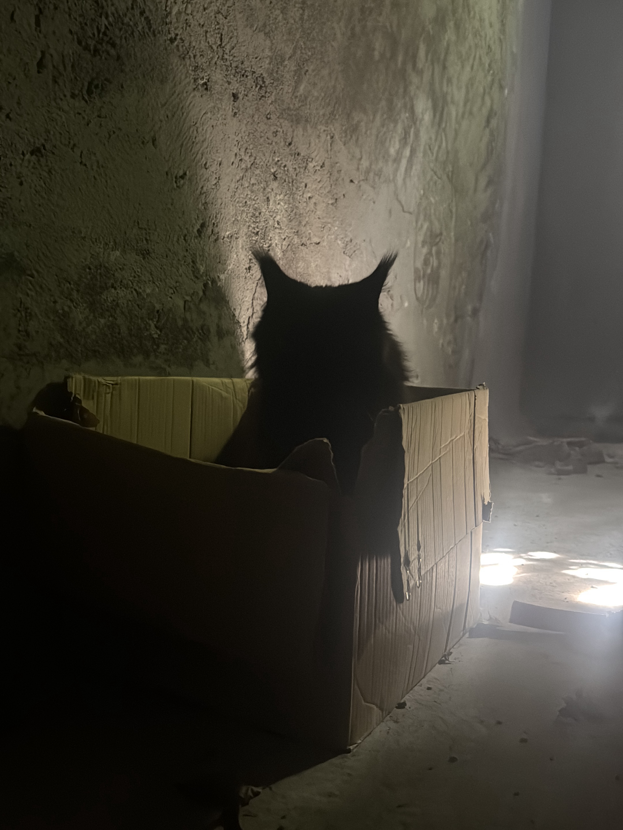 dark, likely black, cat sitting in a cardboard box. The cat's silhouette is visible against a textured, possibly concrete wall. A single paw is hanging over the side of the box. The scene is dimly lit, with a beam of light illuminating the floor to the right of the box. The exact location in Erba, Italy, cannot be determined from the image alone.