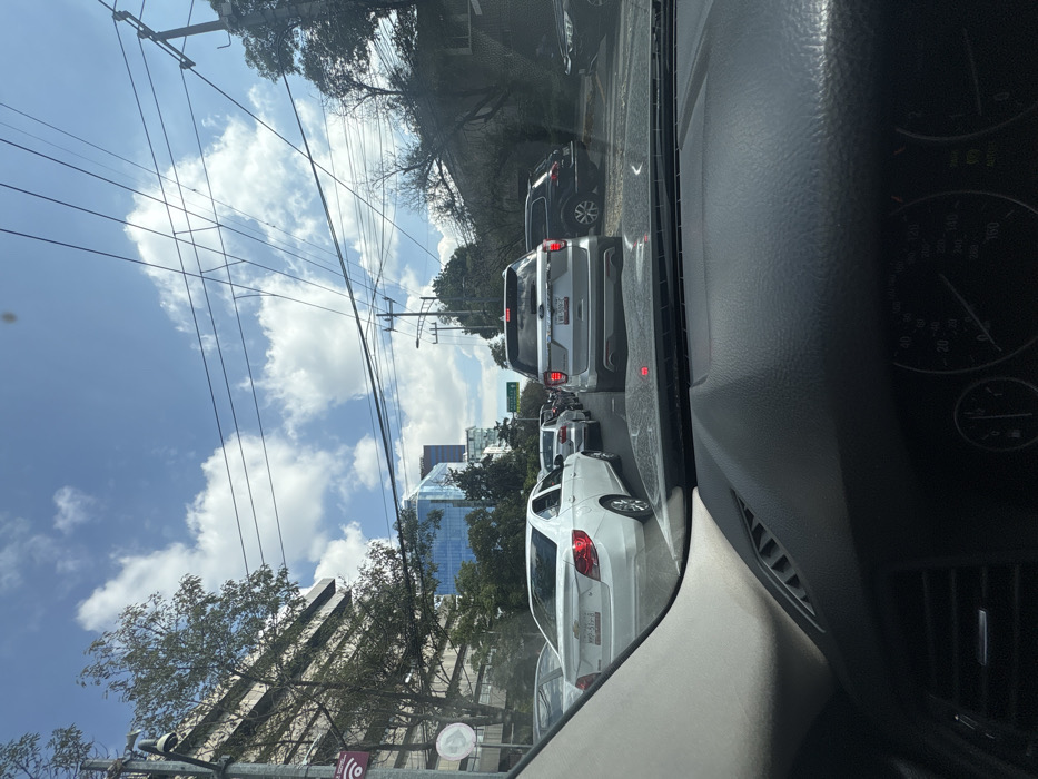 A street scene, likely taken from inside a car, reveals a line of vehicles in traffic
