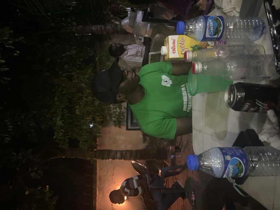 People gather outdoors at night, seated around a table with beverages like juice boxes and bottles of water. One individual wears a bright green t-shirt with text, while another wears a baseball cap. Background greenery adds to the outdoor scene. Poor lighting conditions contribute to the darkness of the image.