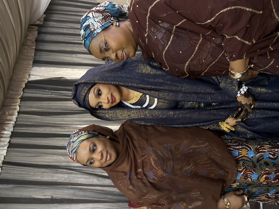 Three women of African descent pose for the camera. From top to bottom: the first wears glasses and a patterned headscarf, covered with a sequined brown top; the second woman is draped in dark fabric with gold trim, sporting elaborate gold jewelry; the third, also in a patterned headscarf, dons a brown covering over a colorful dress. They are indoors, presumably at a special event.