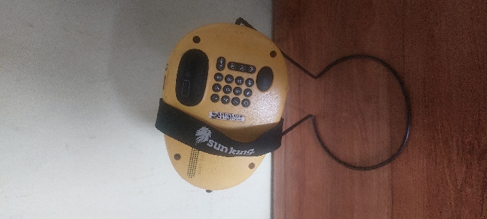 The scene depicts a yellow, oval-shaped electronic device positioned upright on a black wire stand. The device features a numerical keypad (0-9, *, #), several function buttons, and a small rectangular display screen on its upper right side. A black fabric strap, bearing the "Sun King" logo and text, is secured around the device. A speaker grille is visible on the upper left side of the device. A sticker, partially legible, with text like "MATRIXLINK" or similar, is adhered to the device's surface near the keypad. The device and stand rest on a reddish-brown wooden surface, likely a table or desk. A plain, light-colored wall serves as the background. No individuals are present in the image. The location is Mosop ward, Kenya.