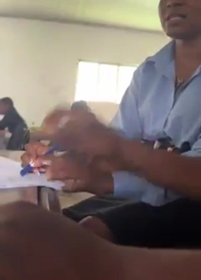 woman in a light blue shirt sitting at a desk in a classroom. She is writing on a piece of paper with a pen. Other students are sitting at desks in the background. The classroom has a window and appears to be well-lit. The woman looks up and speaks while holding the pen.