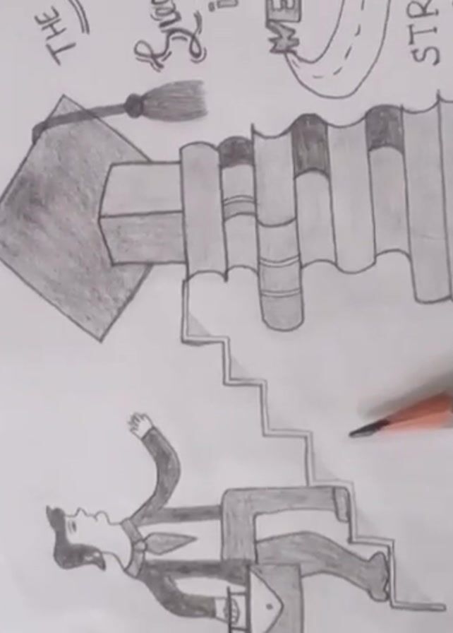static view of a pencil drawing on white paper. The drawing depicts a man in a suit falling down a set of stairs that lead up to a mortarboard hat and a row of books. Above the books, the drawing includes a road that is not a straight line, and a handwritten message that reads "The way to Success is NEVER a STRAIGHT LINE." A grey pencil lies to the right of the drawing. The paper rests on a patterned surface. The video remains stationary and shows the entire scene.