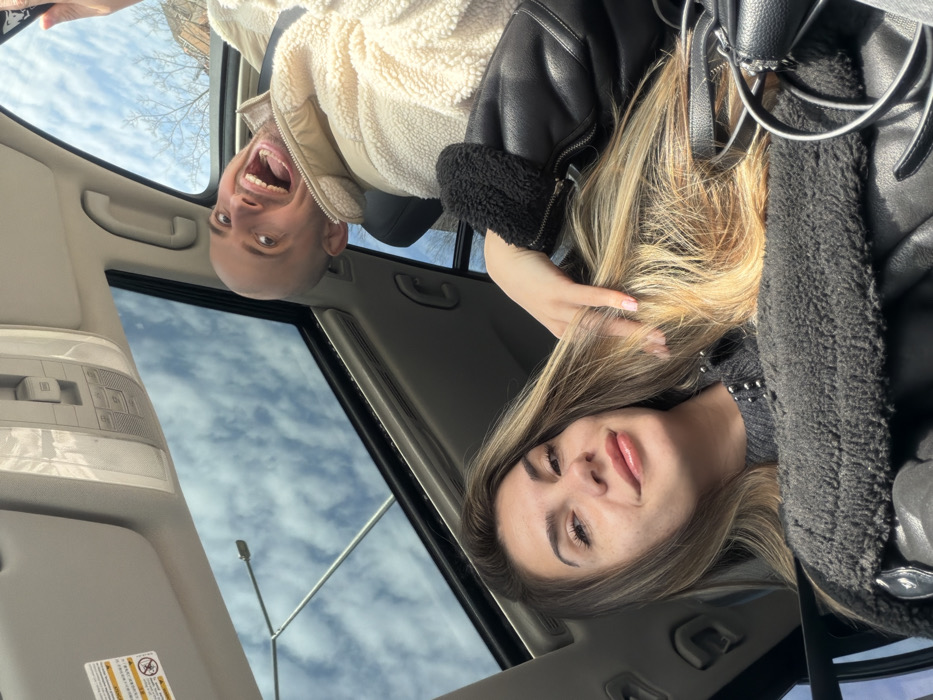 An image captured from inside a vehicle through an open panoramic sunroof depicts two individuals