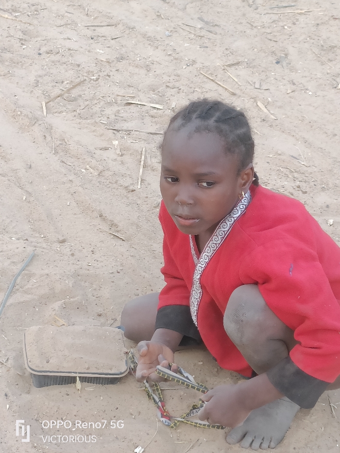 A young girl with braided hair sits on the sandy ground. She wears a red top with decorative trim. She's barefoot, and her skin appears dusty. In her hands, she holds strips of patterned material. Beside her is a rectangular, possibly metal, container covered in dirt. The environment appears arid, with sparse vegetation or debris scattered in the background.