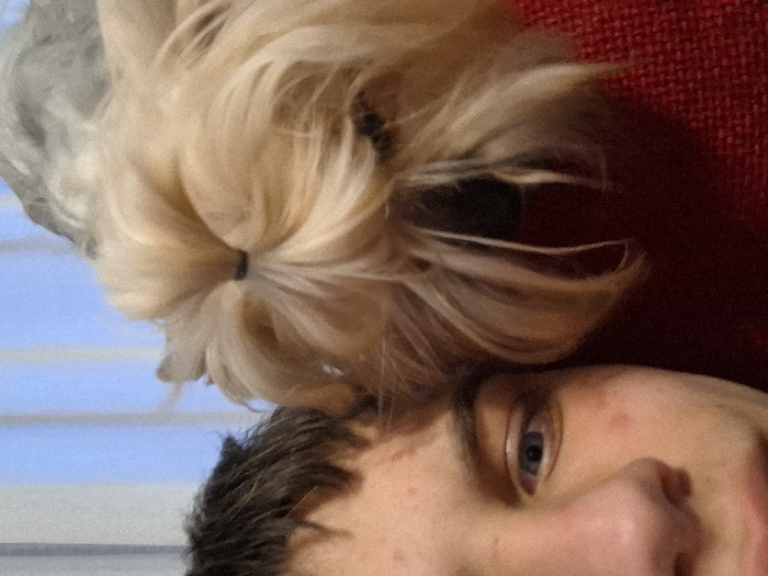 The scene, located in the city of Veliki Preslav, Bulgaria, features a close-up, tightly cropped view of a young person and a small dog. On the left, the lower-right quadrant of a human face is visible, comprising the nose, mouth, and a blue right eye. The skin displays multiple small reddish lesions. Dark brown hair is present on the upper left. On the right, the head of a small dog, consistent with a Yorkshire Terrier, occupies the majority of the space. Its light brown fur is pulled back into a topknot, secured by a black elastic band. A dark muzzle is partially discernible under the fur. The dog's head is positioned immediately adjacent to the person's head. A textured red fabric is visible beneath the dog. The background is an out-of-focus light blue field, potentially a window or interior wall.