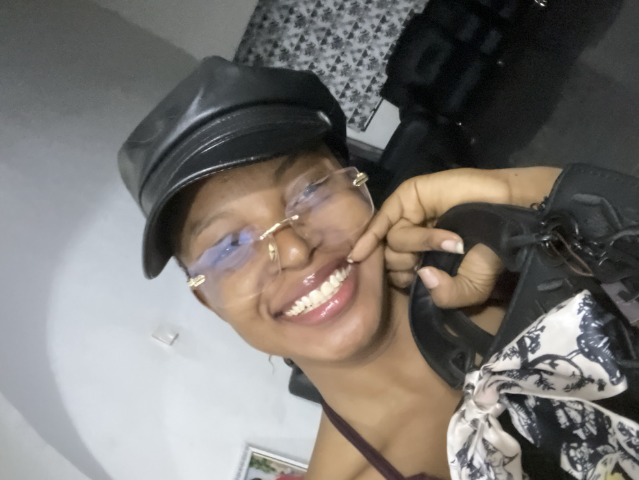 A woman in a black leather cap smiles, showing her teeth. She wears rimless glasses with gold accents. Her hand rests on her cheek. Beside her is a black purse adorned with a patterned white and black scarf tied to the handle. The background is a blurry mix of light and dark patterns, suggesting a room setting.