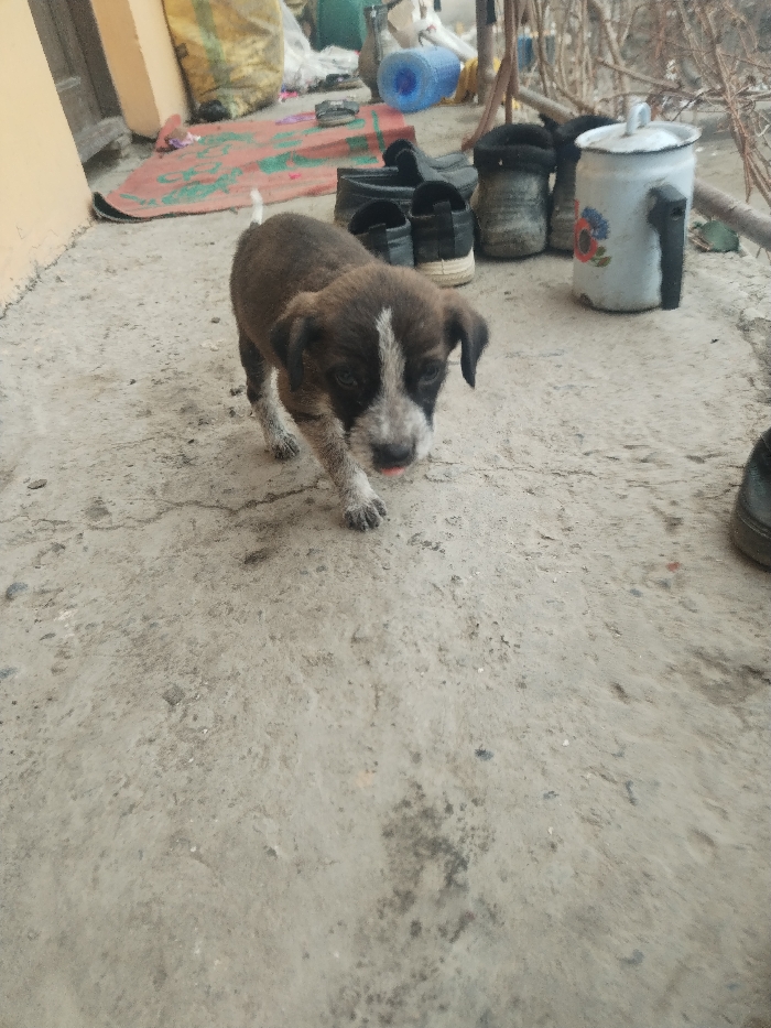 - "The scene depicts a small, tricolored puppy walking on a grey concrete surface within what appears to be an outdoor residential or courtyard area in Toptik-Saray, Uzbekistan" by FM-CNZ8C3, licensed under CC BY 4.0