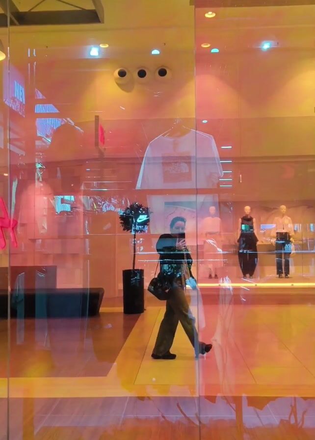 A person stands in front of a store display window in a shopping mall, filming with their phone. The person is wearing dark clothing, and has a dark bag slung over their shoulder. The display window is large and transparent, revealing the interior of the store. Inside, there are several mannequins dressed in various outfits, a small tree in a black pot, and a t-shirt with a logo displayed prominently. The floor is tiled with a light brown material. The window glass has a rainbow iridescent film.