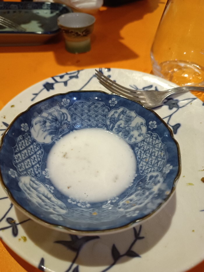 A close-up shows a blue and white patterned bowl containing a small amount of white liquid on top of a larger, similarly patterned plate. A silver fork rests on the plate beside the bowl. In the background, a green and brown shot glass sits on an orange surface, with a partially visible glass of orange liquid to the right.