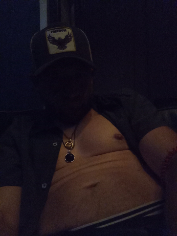 An adult individual, appearing male, is depicted from the chest up in a dimly lit interior setting. The person is wearing a dark baseball cap featuring a light-colored square patch with a dark eagle silhouette and the word "FREEDOM" above it; the cap casts a deep shadow, obscuring the face. A dark short-sleeved button-up shirt is worn unbuttoned, revealing the individual's chest and abdomen. Two necklaces are visible: one with a gold-toned, intricately designed circular pendant, and another with a dark, possibly black, circular stone pendant. A red beaded bracelet is present on the right wrist. The waistband of dark underwear with a prominent horizontal white stripe is visible below the exposed abdomen. The individual is reclined or seated against a dark, featureless background, possibly an upholstered surface. The specific location within Seattle, United States, is not discernible from the visual evidence provided in the image.