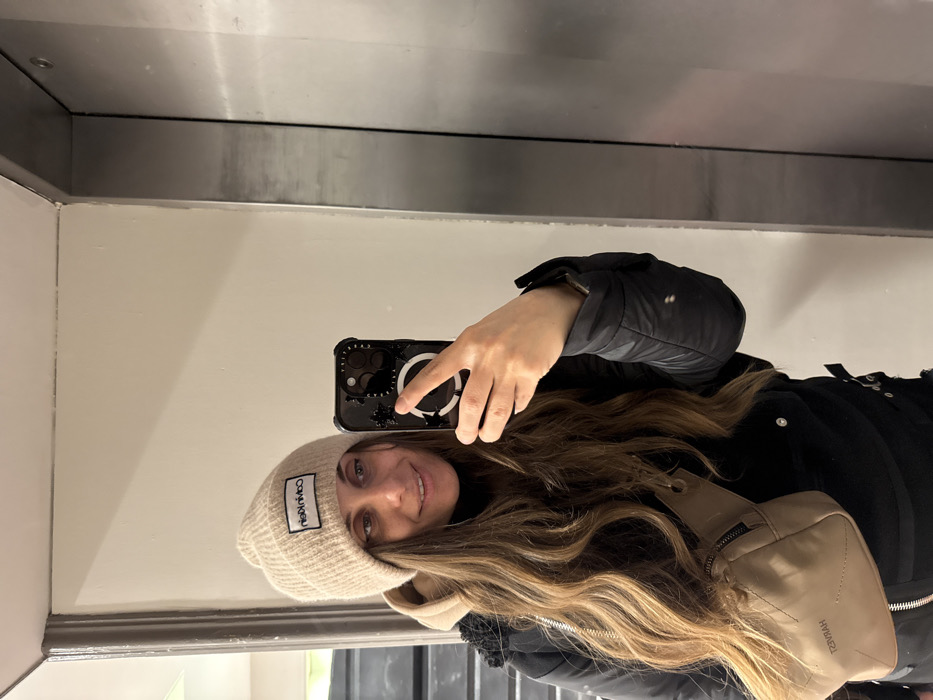 An indoor mirror selfie depicts a female subject, visible from the chest up, in the City of Edinburgh, United Kingdom. She has long, wavy brown hair and is smiling faintly. She wears a light beige ribbed beanie with an inverted "CALVIN KLEIN" label, a black puffer jacket over a beige hooded sweatshirt, and a black turtleneck. A beige crossbody bag with an inverted "HARVEST" logo is slung over her left shoulder. In her right hand, she holds a black smartphone, likely an iPhone, encased in a black protective cover featuring a prominent white MagSafe ring, indicating she is capturing her reflection. The background shows an off-white wall to the left and a silver metallic panel, consistent with an elevator door, to the right.