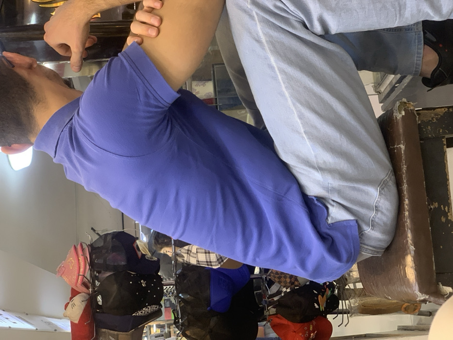 The image depicts an interior commercial setting, likely a shop, located in Barza Municipality, Syria. In the foreground, a male individual is seated on a worn, dark brown upholstered stool, viewed from behind and slightly to the right. He wears a short-sleeved, solid blue polo shirt, light blue denim jeans, and black athletic-style shoes with subtle red accents. His right arm is bent, with his right hand resting on his left forearm. The left side of his head, showing dark hair and what appears to be a glasses frame, is visible. To the left of the seated individual, a metal display rack holds various hats, including multiple black baseball caps (some with white details), a red cap, a blue cap, a brown patterned cap, a pink sparkly visor, and a white novelty hat resembling Hello Kitty. In the mid-ground to the right, a second individual, partially obscured, is visible wearing a plaid shirt. Further right, a dark, reflective surface with a gold-colored frame is present, possibly part of a counter or display cabinet. Overhead, a rectangular fluorescent light fixture illuminates the scene.