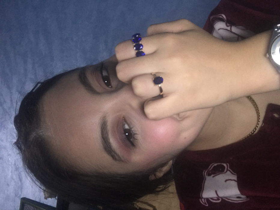 A person, head turned to the side, gazes at the camera, eyes slightly narrowed. They wear two rings adorned with blue stones on their fingers, as well as a watch on their wrist. A gold chain is visible around their neck. The person's top, dark red in color, features a white cartoon design. The background is a textured blue wall. The image appears to be lit from above and slightly to the side.