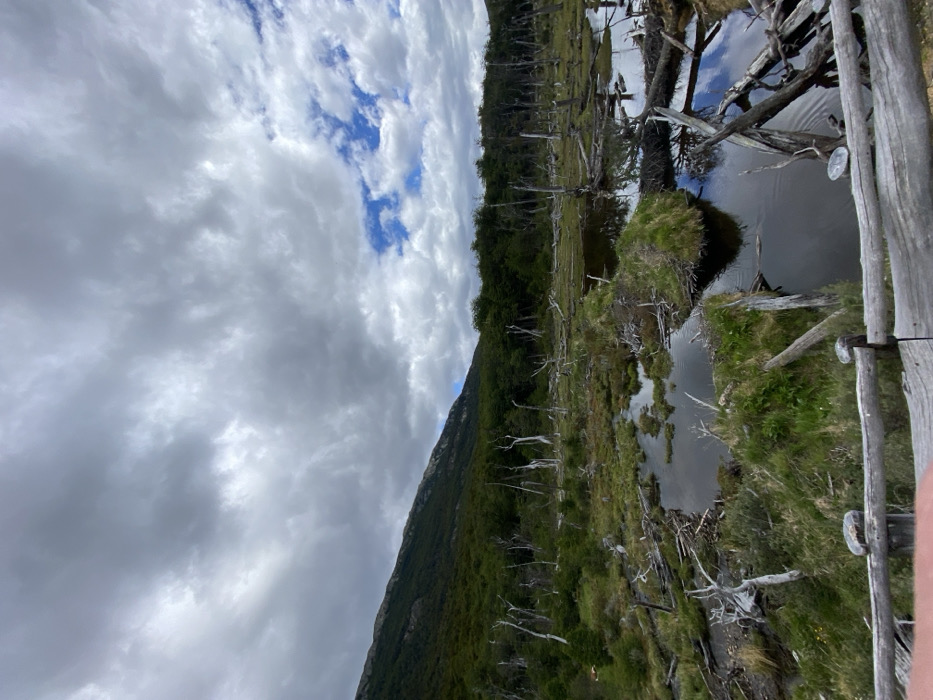 A picturesque landscape features a mountain slope meeting a marshy area with small ponds. Sparse, skeletal trees dot the green landscape. Water reflects the overcast sky with fluffy clouds. A wooden structure, possibly a walkway, is visible on the right edge. The scene conveys a sense of serenity despite the remnants of dead trees, creating a somewhat melancholic but beautiful view.