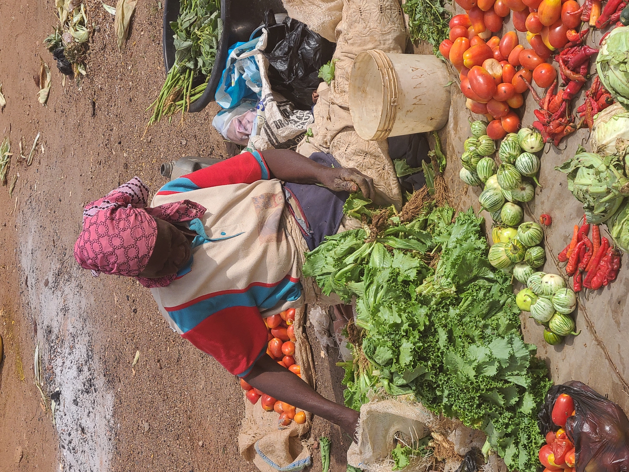 A woman is sitting on the ground in what appears to be a market area in Gura Top, Nigeria. She is surrounded by various produce including tomatoes, leafy greens, eggplants, peppers, and cabbages. The produce is arranged on the ground and in containers around her. She is wearing a colorful outfit and a headscarf. The ground is a mix of dirt and concrete. There are bags and containers near her, suggesting she is selling these items.