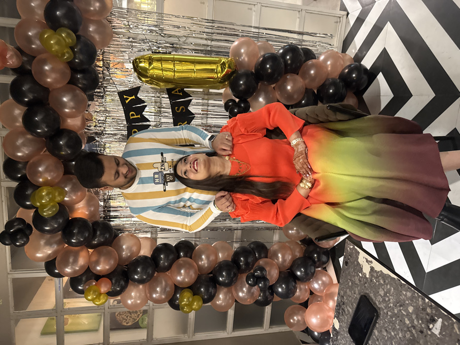 A couple poses in front of a balloon arch, with black, brown, and gold balloons, and a silver backdrop spelling out "Happy Birthday