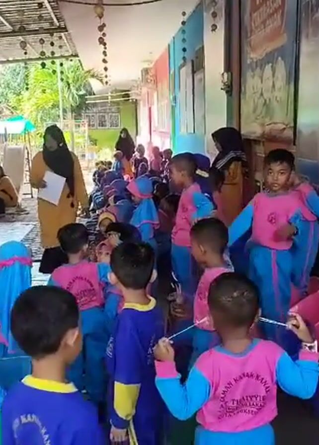 group of preschool children, wearing matching blue and pink outfits, gathering in an outdoor covered area that appears to be part of a school