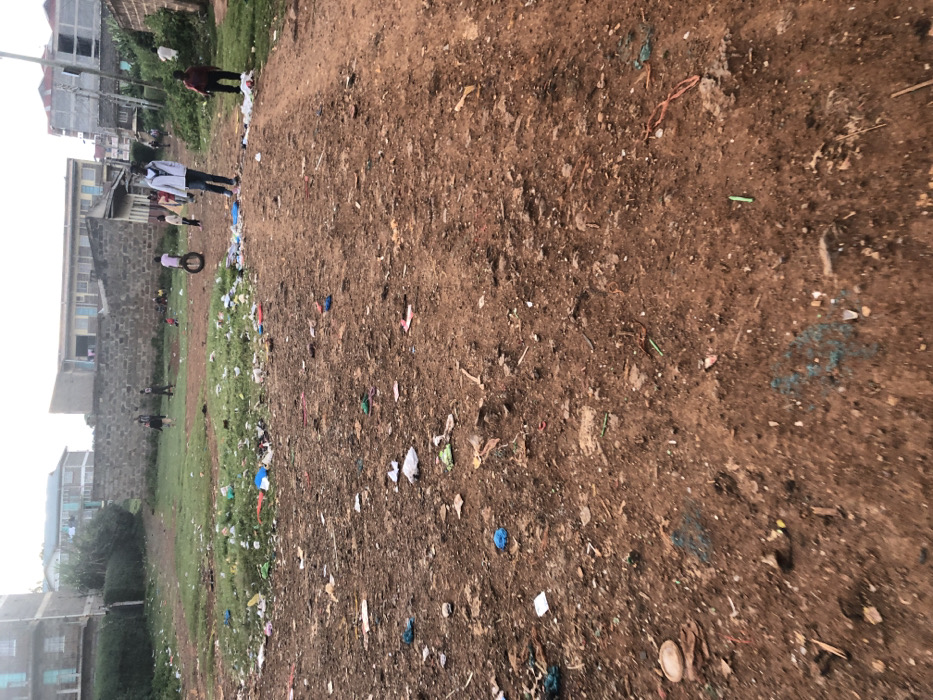 A field littered with trash dominates the scene. Soil and sparse grass cover the ground, punctuated by scattered plastic, paper, and other debris. Several people stand near the edge of the field, one holding a tire. Buildings surround the perimeter, including a brick wall and multi-story structures, suggesting an urban or suburban setting. The composition suggests an issue of pollution or neglect in this environment.