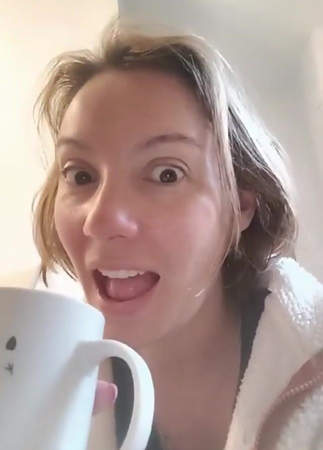 A woman is centered in the frame, holding a white mug with black paw prints. She has fair skin, hazel eyes, and light brown hair with blonde highlights. She's wearing a dark gray top and a white, fluffy zip-up hoodie. The woman takes a sip from the mug. The background is a blurred white wall.