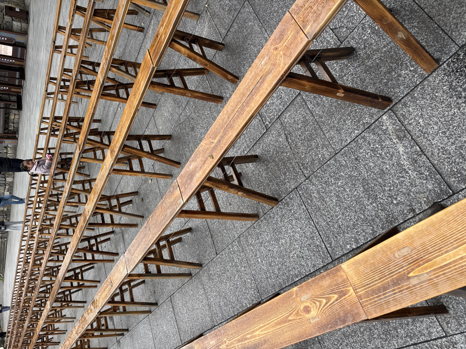 The image captures an outdoor public area in Furong, China, paved with rectangular grey granite tiles. Approximately ten parallel rows of long, light brown wooden benches, each supported by multiple dark brown A-frame trestle bases, extend from the foreground into the background. A single child, appearing to be between three and five years old, with dark hair and dressed in a light pink or purple padded jacket, is seated alone on a bench in the mid-ground, facing towards the left. In the background, behind the rows of benches, a dark stone wall and the facades of traditional buildings featuring dark wood elements are visible, with steps leading to a raised area. Several indistinct adult figures are present in the far background, standing or walking. The scene is evenly lit, suggesting an overcast sky.