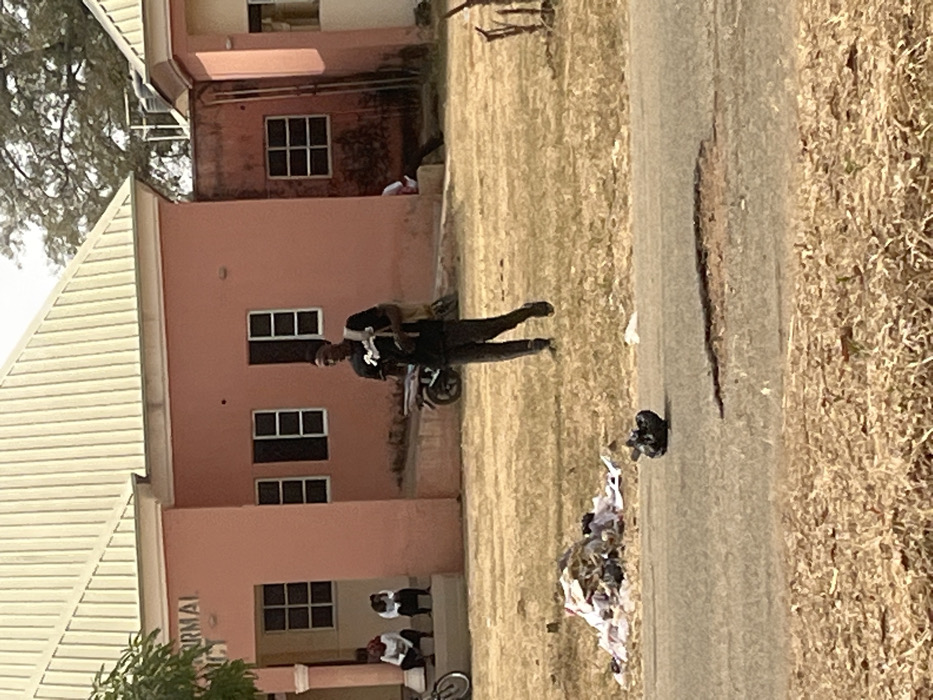 - "The image captures an outdoor scene in Nassarawa, Nigeria, depicting a young adult male walking across a dry, grassy area in front of two peach-colored buildings with light corrugated metal roofs" by FM-awKsJ2, licensed under CC BY 4.0