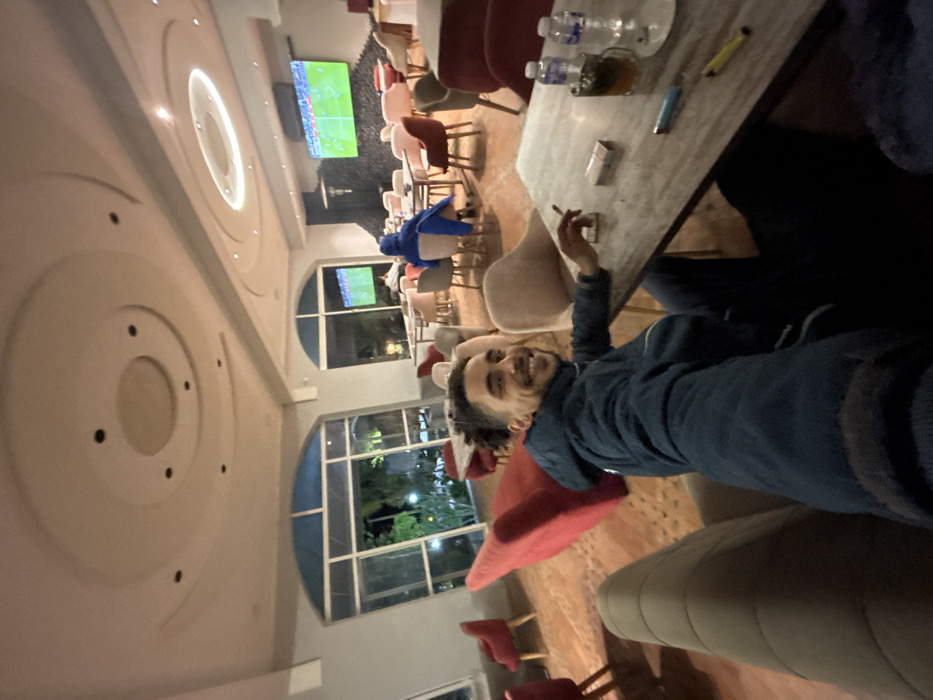 A dimly lit interior shot of a cafe, with a man facing the camera, smoking. He's seated at a table with water bottles, a lighter, and cigarettes. In the background, several tables and chairs are visible, along with arched windows and a TV screen displaying a football match. The cafe has an ornate ceiling design. The photo is slightly rotated and the man is smiling.
