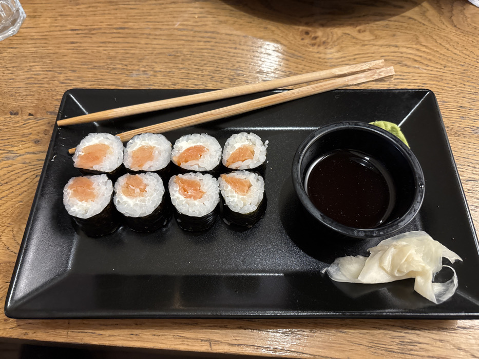A top-down image, captured in Karlovo, Bulgaria, displays a culinary arrangement on a black rectangular plate situated on a light brown wooden table with visible grain. The primary subjects are ten pieces of maki sushi, each featuring salmon-colored fish and white rice encased in dark nori, presented in five pairs. A pair of light brown wooden chopsticks is diagonally positioned on the right side of the plate, overlying a portion of the sushi. A small, black, circular dish containing a dark brown liquid, consistent with soy sauce, is located at the bottom center of the plate. Adjacent to this, on the left, is a cluster of translucent, thinly sliced, light-colored pickled ginger. A small, indistinct light green substance, consistent with wasabi, is partially visible beneath the sauce dish. The upper right background shows an out-of-focus portion of a clear drinking glass or container.