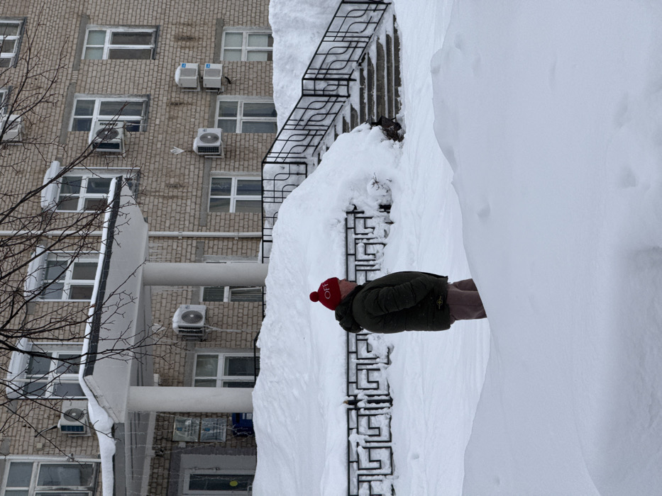 This image depicts a snow-covered urban environment in Chaikovsky, Russia. A single individual stands in profile, facing right, in the foreground. The person wears a dark olive green puffer jacket with a circular patch on the left arm, light brown trousers, and a red knit beanie displaying white text that reads "OFF". The ground is covered by deep, undisturbed snow, forming significant drifts around the individual. In the background stands a multi-story building constructed of light brown brick. It features numerous white-framed windows and several external air conditioning units mounted on its facade. A central entrance area includes a white canopy supported by two white columns, both heavily laden with snow and exhibiting hanging icicles. To the right of the entrance, a set of concrete stairs with black metal railings is partially submerged and covered by snowdrifts, leading upward. A low-lying decorative black metal fence runs horizontally across the midground, largely obscured by snow. Bare tree branches are visible in the upper center of the frame, indicating a winter setting.