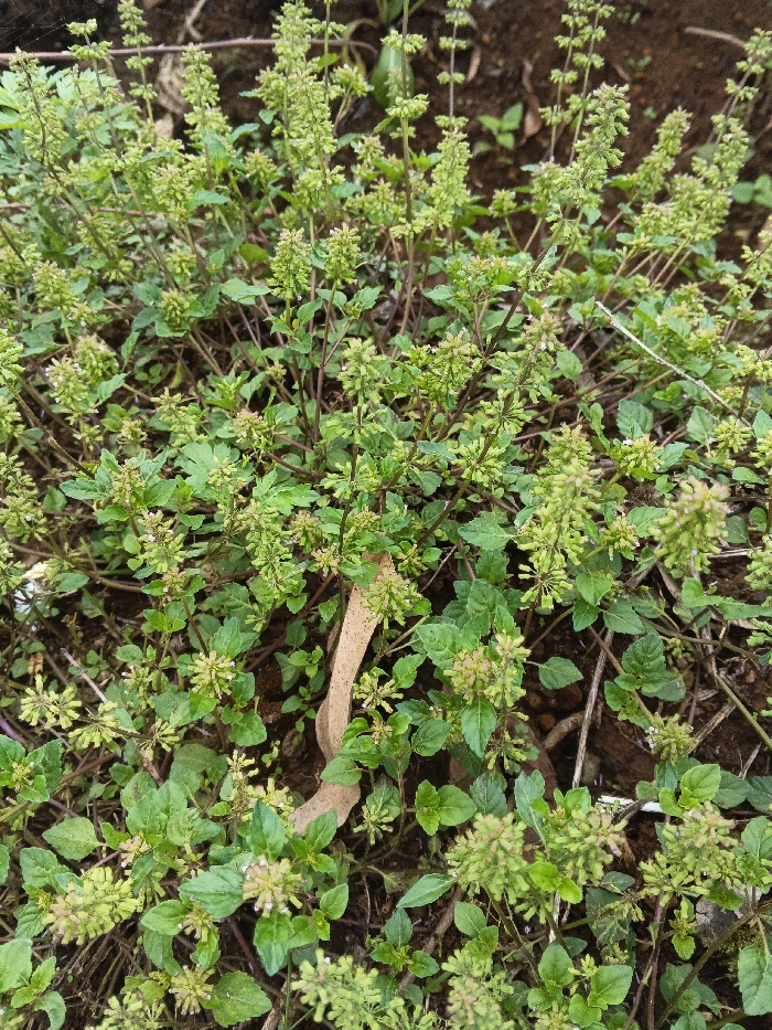 This image presents a dense aggregation of herbaceous vegetation rooted in dark brown soil in Pinnwe, Myanmar (Burma). The dominant subject is a cluster of green plants, each exhibiting numerous light green, ovate leaves. Throughout the plant, multiple erect inflorescences are visible, characterized by tightly clustered light green floral buds, with some displaying minute white blossoms. Thin, dark reddish-brown stems support the foliage. A single, dry, light brown elongated leaf lies partially obscured within the lower-middle left section of the plant cluster. No human or animal subjects, artificial structures, or active interactions are discernible.