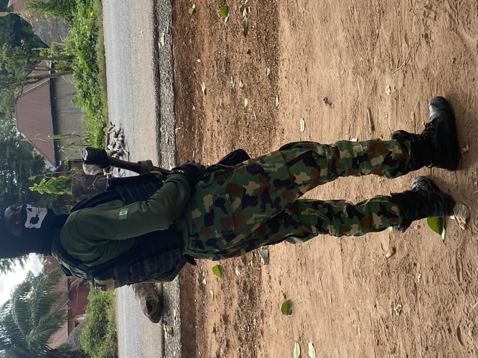A soldier in camouflage stands on a dirt path next to a paved road. He wears black boots, gloves, and a mask featuring a skull design. He carries a rifle with a grenade launcher attachment. The soldier also wears a vest over a green shirt with a patch resembling the flag of Nigeria. Buildings with reddish roofs are visible in the background.