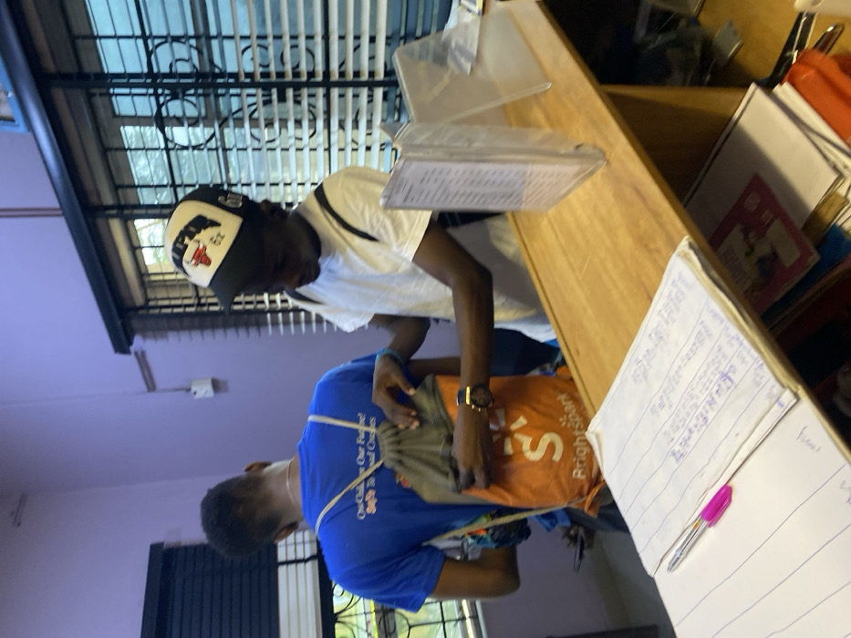 The scene depicts an indoor environment, likely an office or reception area, located in Egan, Nigeria. The walls are painted lavender. On the left, a male subject, facing away from the camera, wears a blue t-shirt with text visible on the back: "One Children Our Future! Safe For Our Children." He holds an orange and gray drawstring bag with a "Brightspark" logo. To his right, a second male subject, with a dark complexion, wears a white t-shirt, a black backpack, and a black and white trucker hat featuring a bull logo. He has a gold-colored watch on his left wrist and a blue bracelet on his right. His right hand is inserted into the drawstring bag held by the first individual. A light-brown wooden counter spans the foreground. On the counter, a stack of handwritten papers or a notebook lies beside a pink pen, and a clear, folded plastic document holder is visible further to the right. The background includes windows fitted with horizontal blinds.