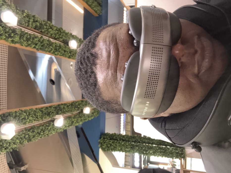A person wearing a "De Relax" brand massage device resembling headphones is captured indoors. The device is gray and covers the eyes and temples. The person has short, dark hair. The background features architectural details, including wall panels, linear lighting, and greenery, giving the impression of a modern interior space. The image is slightly rotated.