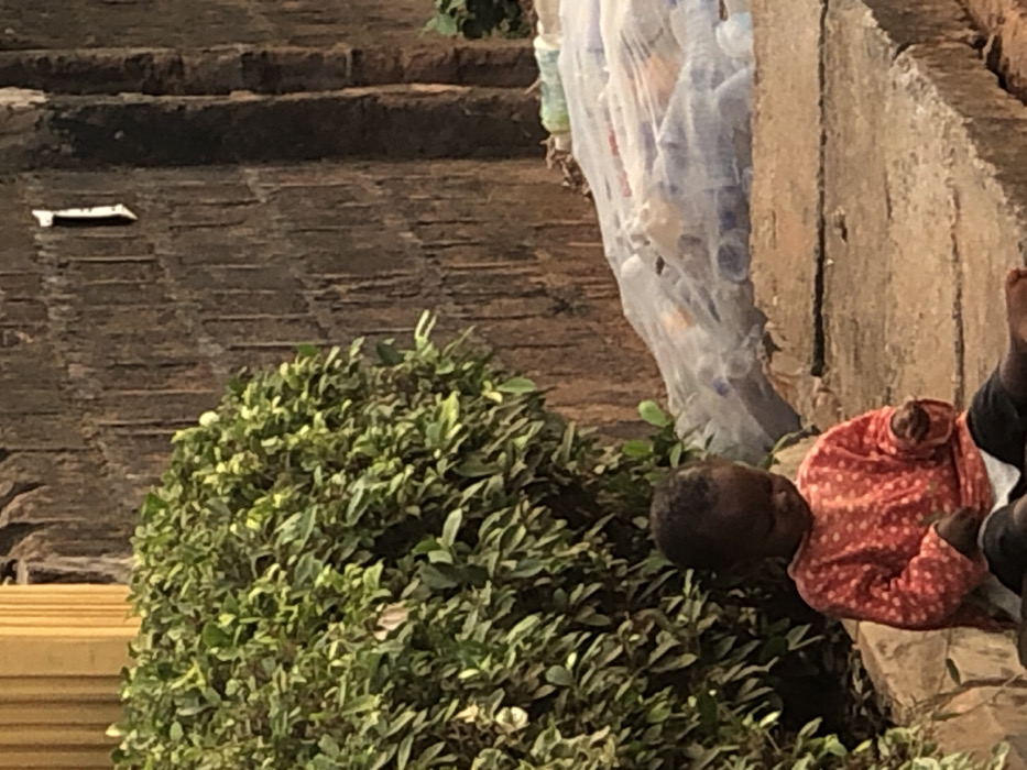 The scene depicts an outdoor area in Neni, Nigeria. A single young child, appearing to be a toddler with dark skin and short dark hair, is seated on a rough grey concrete ledge. The child wears a long-sleeved orange shirt with white polka dots, dark bottoms, and a white undershirt, and is observed looking down at a small object held in their hands. To the child's left and rear is a dense green shrub. Behind the child and to the right, a dark, textured wall, likely concrete or brick, rises with vertical striations, bearing a white numeral "1" in its upper right section. Adjacent to the child, on the concrete platform, a quantity of clear plastic bottles, some containing colored liquids, is partially obscured by a translucent white plastic covering. A vertical yellow structure is partially visible in the upper left corner.